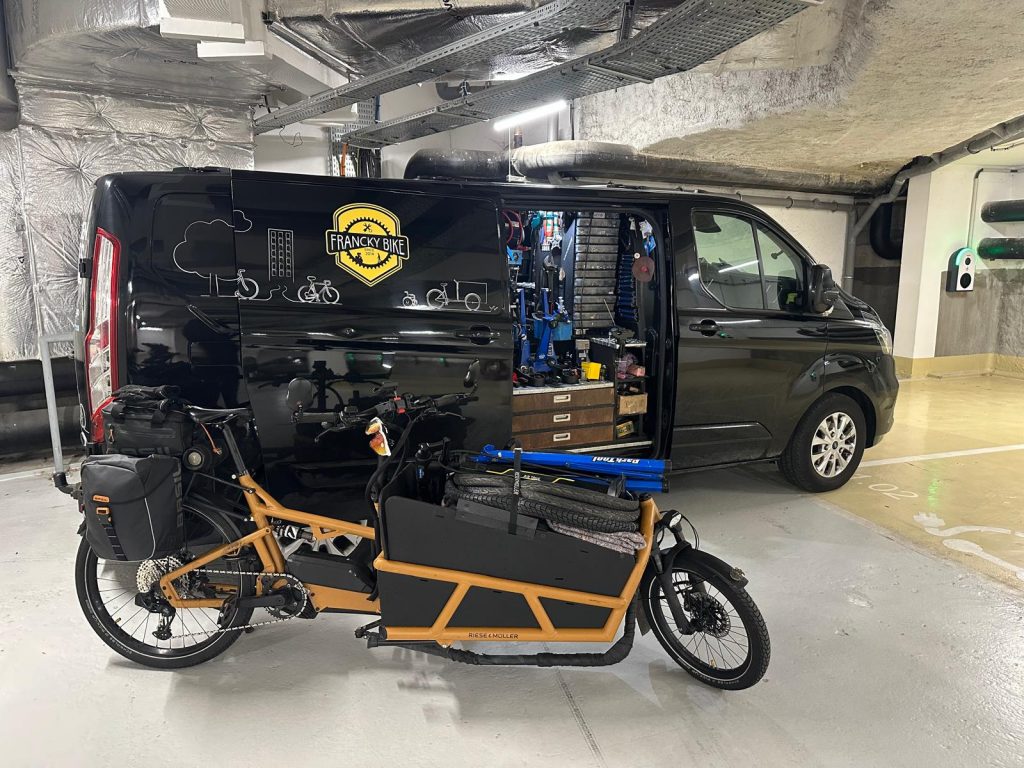 Et pour les déplacements en ville, rien de tel que mon vélo-cargo, pratique, écolo et toujours prêt à transporter outils et pièces pour réparer votre vélo directement chez vous ou sur votre lieu de travail !